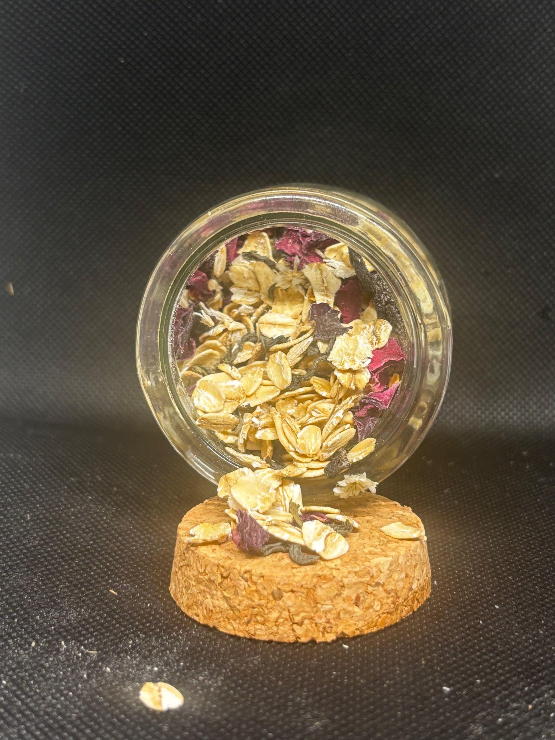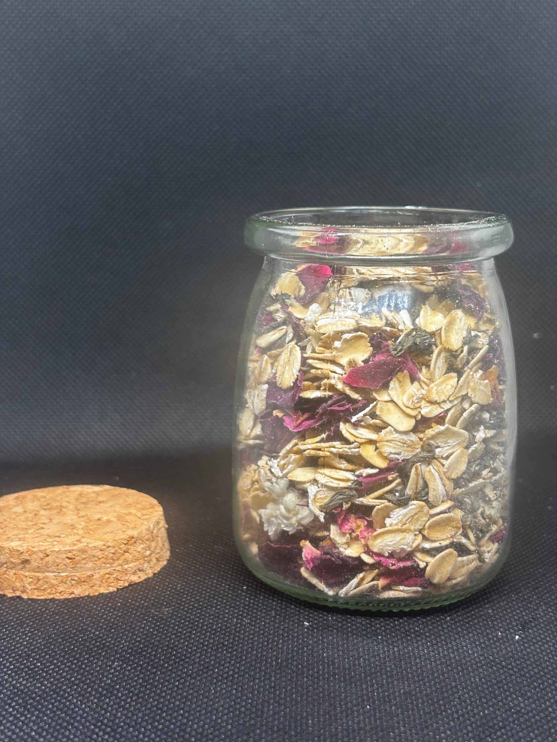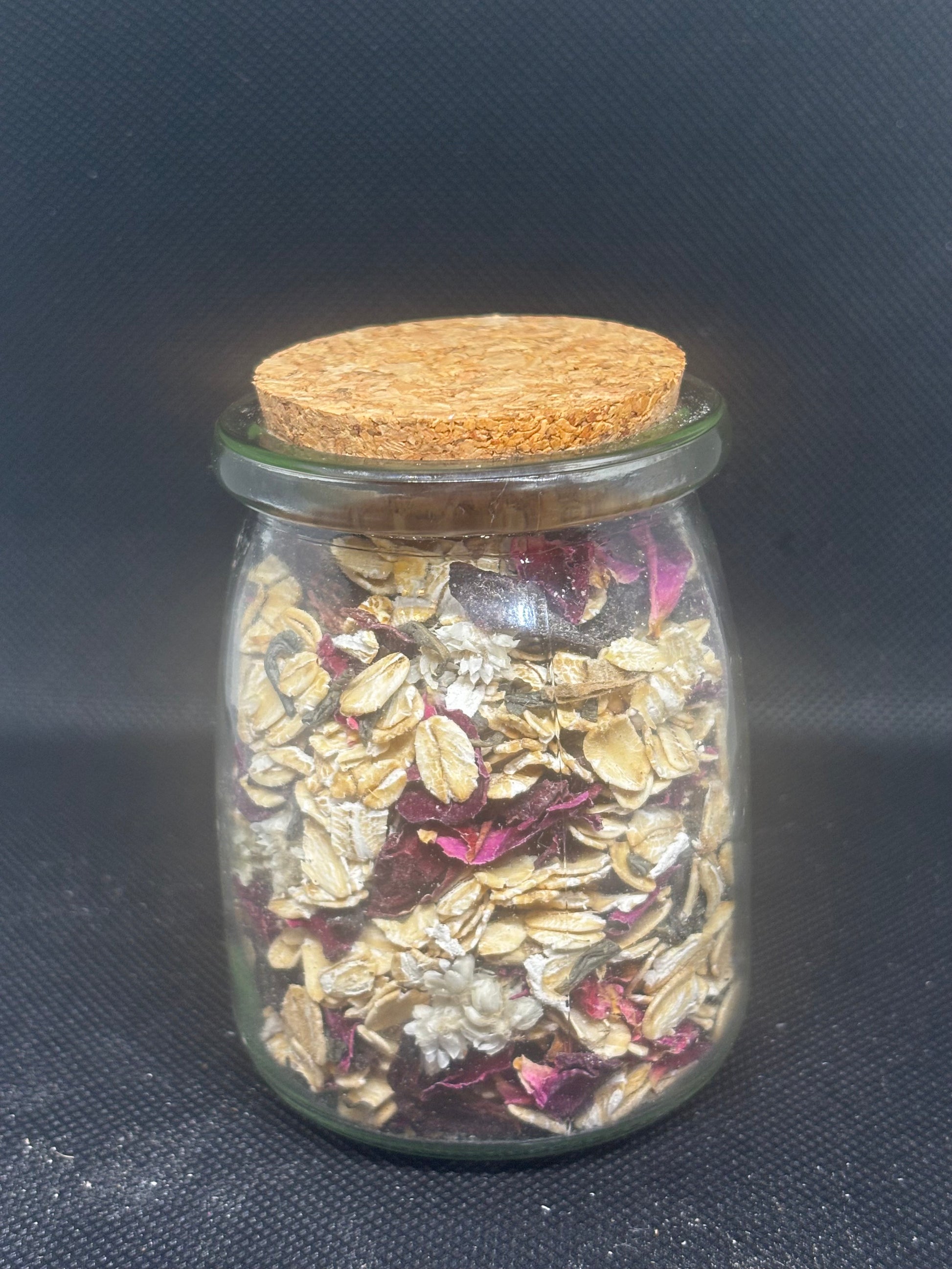 ingredients: Rolled oats, rose petals, mullein, green tea and hibiscus